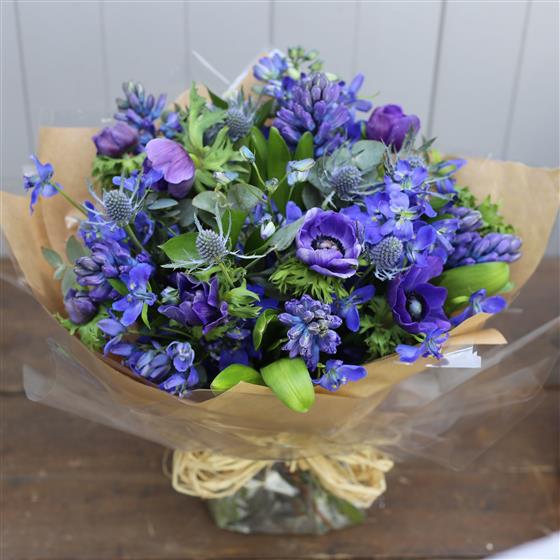 A hand tied bouquet made of seasonal true blue flowers and complimenting foliage.