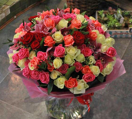 Please note that this is a mixed rose bouquet of the finest roses we have in stock. Accompanied with stunning orchids. It is very large and will make someone extremely happy. Kisses guaranteed.