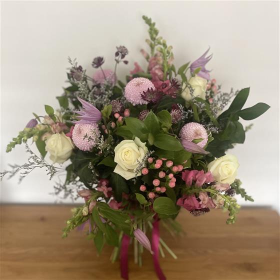 A beautiful bouquet of soft pinks and whites, nestled amongst seasonal wild greenery.