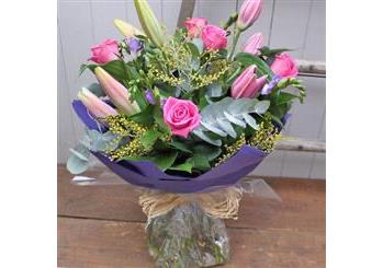 Large headed long stemmed pink roses, beautifully scented freesias and lilies mixed with spring foliage to make up this feminine hand tied bouquet.
