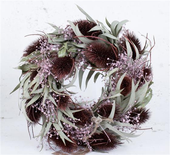 A beautiful dried wreath in Ruby reds and pinks complimented using Eucalyptus Nicoli foliage.