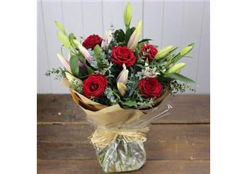 5 Beautiful Fresh Red Roses, guaranteed to last 7 days and 3 Scented Oriental lilies with complimenting foliages.