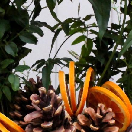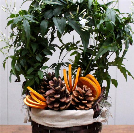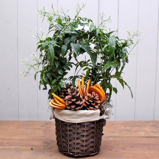 Highly scented jasmine plant presented in a wicker basket with seasonal touches of orange slices and fir cones.